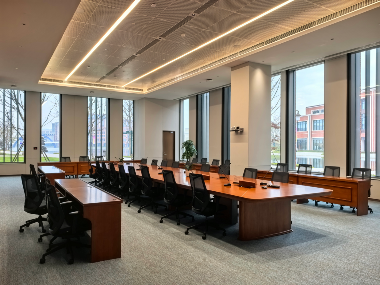 高端會議場景:33間集成會議室與4間VIP會議室,集成AI降噪、4K超高清視頻會議及多屏聯(lián)動,滿足高層決策與遠程交流需求。